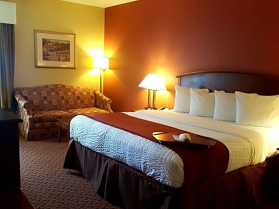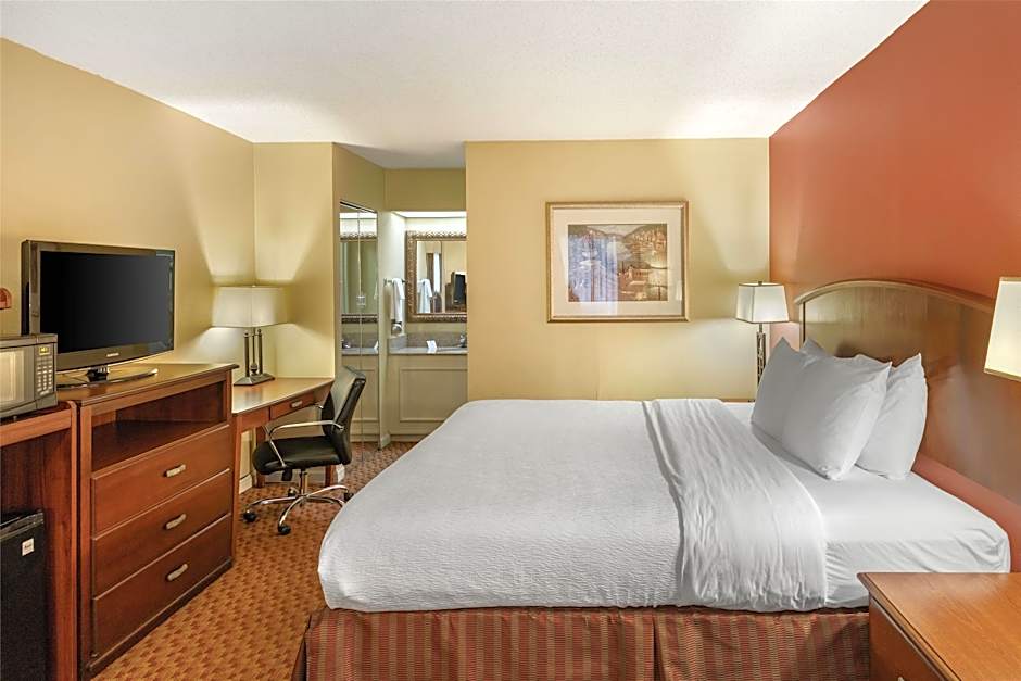 This guestroom includes a 32-inch flat-screen TV, a microwave, and a private bathroom with an accessible bath.